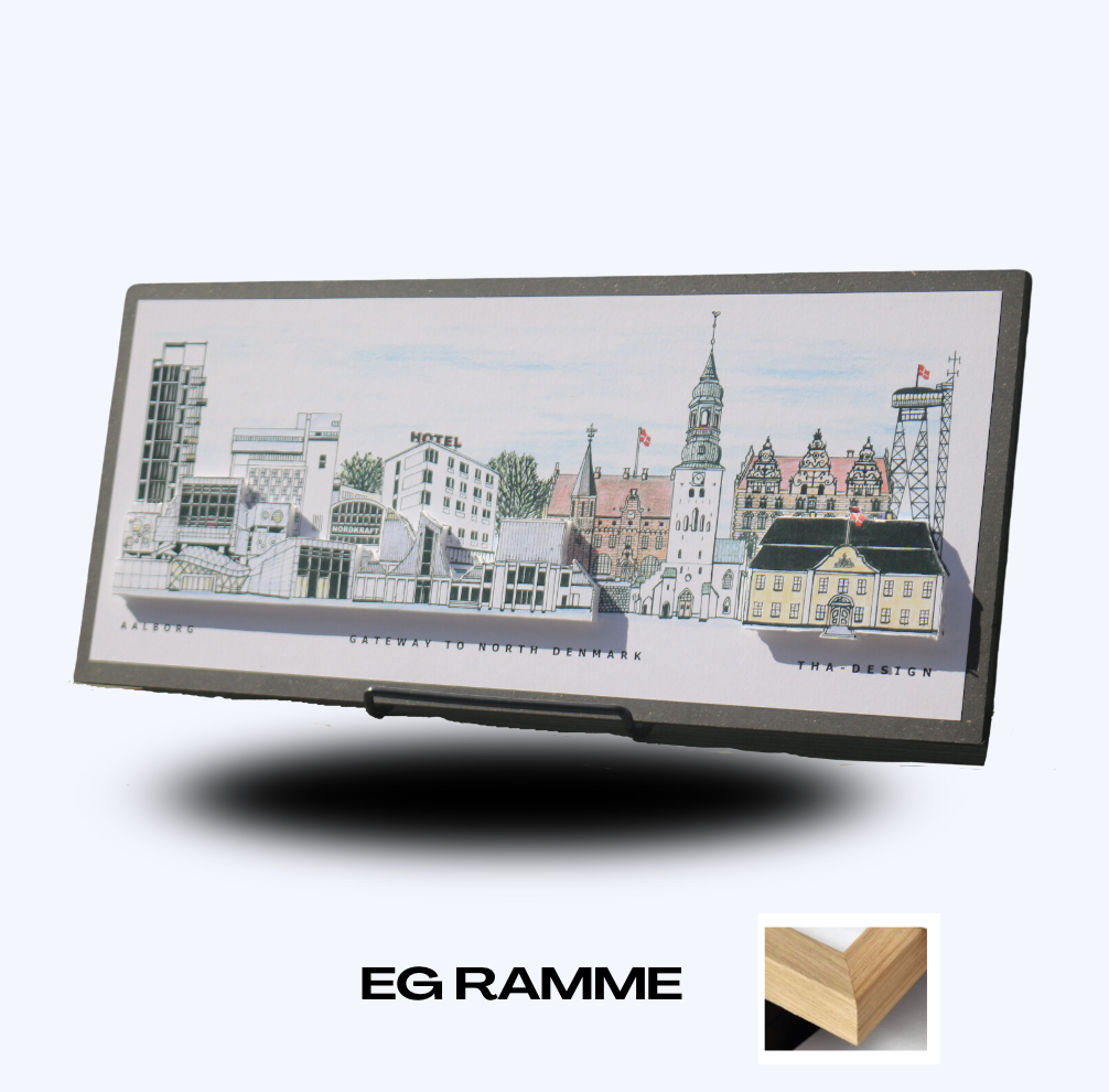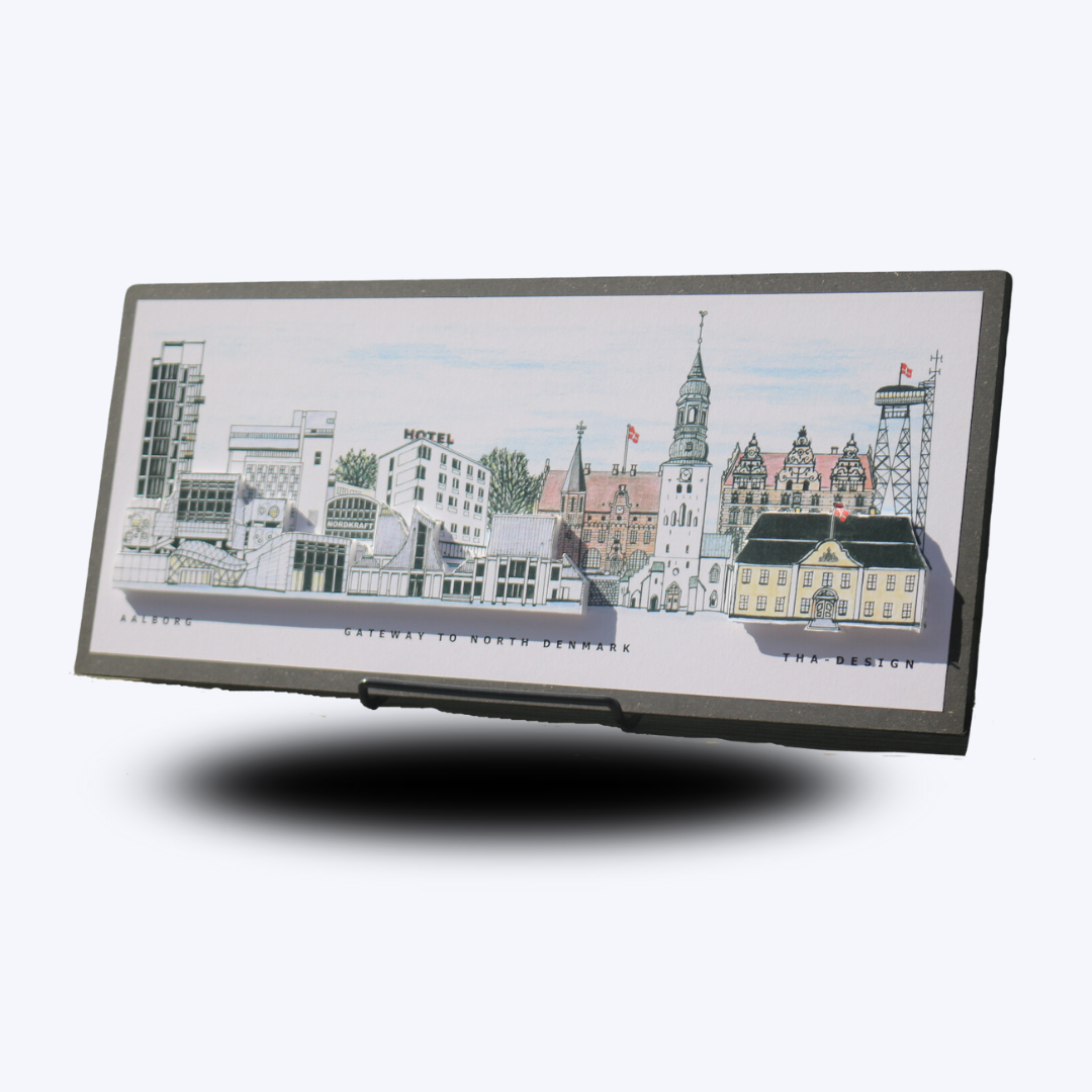 Hvad er et 3D-bymotiv? Et 3D-bymotiv er et håndtegnet bybillede, skabt af vores dygtige kunstner Torben. Torben har specifikt valgt de mest karakteristiske bygninger fra hver by og samlet dem i ét motiv. De forreste bygninger på billedet er derefter skåret ud i hånden og monteret på en 5 mm skumplade, hvilket giver en fantastisk 3D-effekt, når produktet hænger derhjemme i stuen.Håndmalet 3D-ler relief