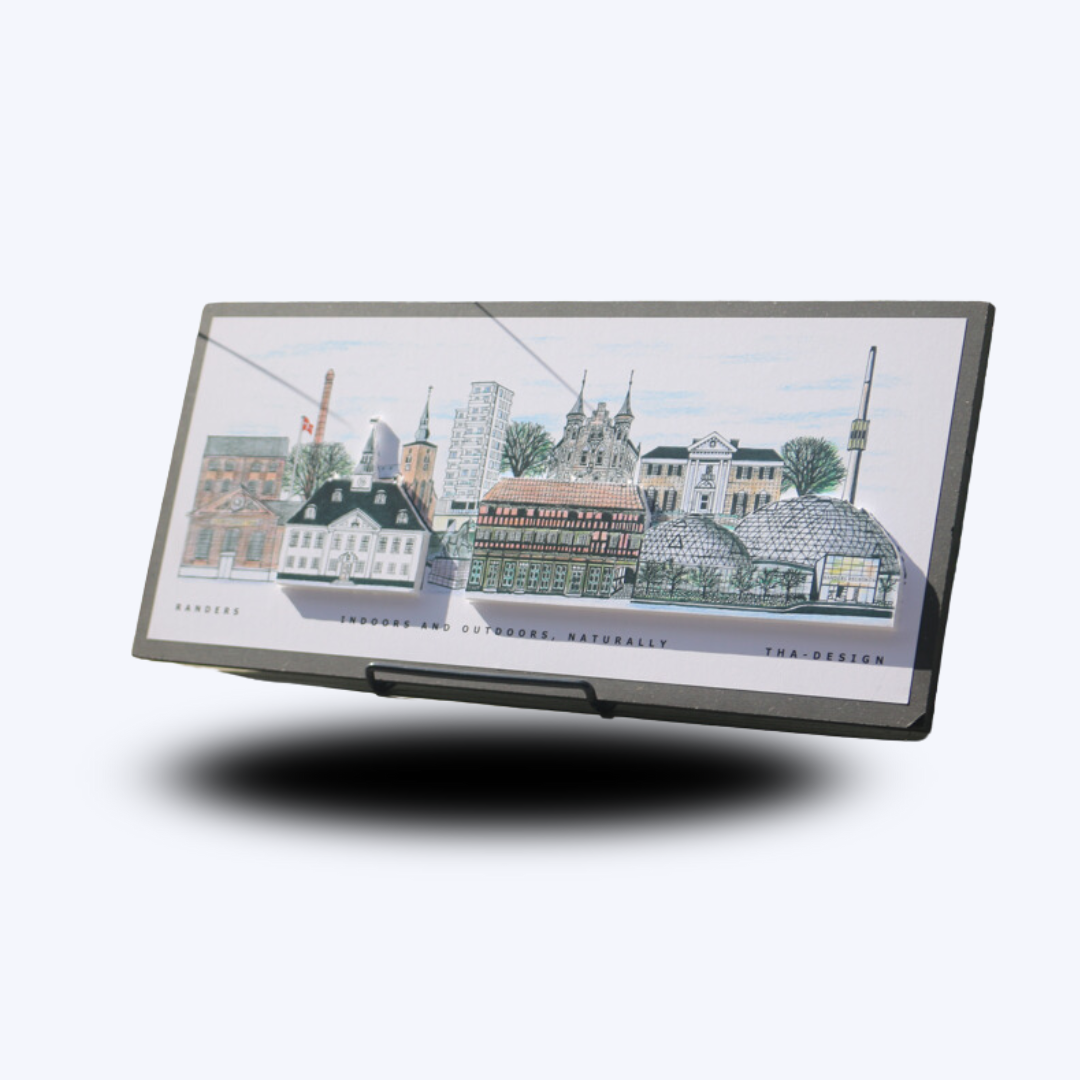 Hvad er et 3D-bymotiv? Et 3D-bymotiv er et håndtegnet bybillede, skabt af vores dygtige kunstner Torben. Torben har specifikt valgt de mest mærkværdige bygninger fra hver by og samlet dem i et motiv. De forreste bygninger på billedet er derefter skåret ud i hånden og sat på en 3 mm flamingoplade, hvilket giver en fantastisk 3D-effekt, når produktet hænger derhjemme i stuen.Håndmalet 3D Ler Relief