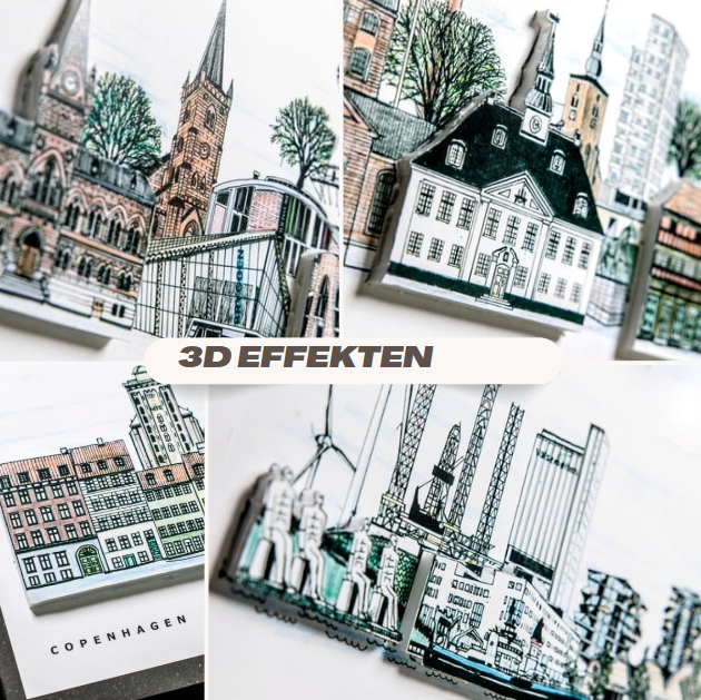 Jeg ville tilføje en ekstra dimension, så jeg begyndte at eksperimentere med en 3D-effekt. Efter mange forsøg fandt jeg den perfekte metode: Ved at skære de forreste bygninger ud i foamboard og montere dem over det trykte motiv skabes en diskret, elegant dybde. Nu kunne jeg præsentere byerne med en visuel effekt, der næsten kalder på, at man går helt tæt på og opdager detaljerne.