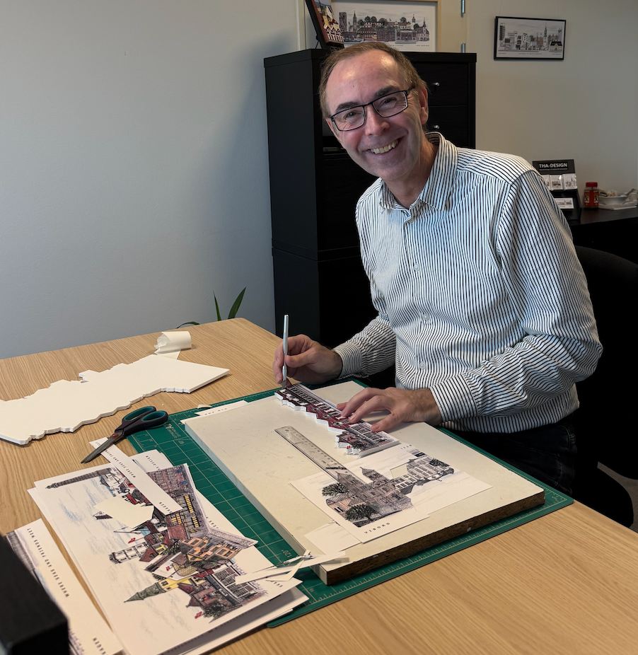 For at give mine motiver ekstra liv tilføjer jeg en særlig 3D-effekt. Det betyder, at jeg skærer enkelte bygninger ud i hånden og monterer dem på en skumplade, så motivet får en helt anden dybde og karakter. Det er et tidskrævende arbejde, og ja – det giver ømme fingre – men det er det hele værd, når resultatet står færdigt.